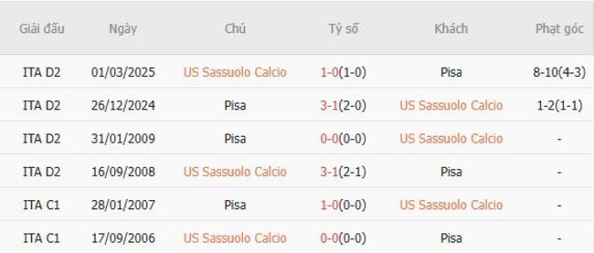Thành tích đối đầu quá khứ giữa Sassuolo vs Pisa