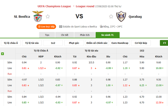 Tỷ lệ kèo SL Benfica vs Qarabag