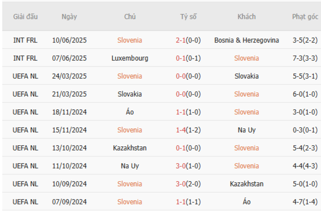 Slovenia đang có phong độ khá ấn tượng với thành tích bất bại trong 5 trận gần nhất (3 thắng, 2 hòa). Tuy nhiên, họ lại cho thấy sự kém hiệu quả trên mặt trận tấn công khi chỉ ghi được 5 bàn.