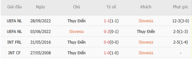 Thành tích đối đầu quá khứ giữa Slovenia vs Thụy Điển