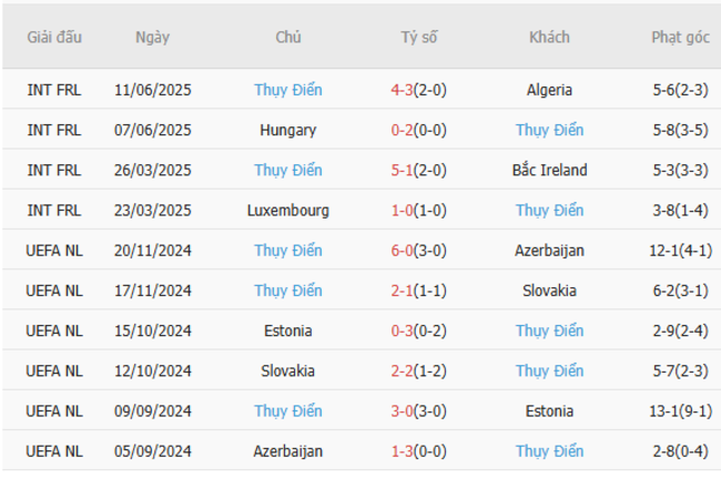 Trái lại, Thụy Điển thể hiện sức mạnh áp đảo với 4 chiến thắng trong 5 trận, ghi tới 17 bàn thắng. Dù để lọt lưới 5 lần, nhưng hiệu suất tấn công cao vẫn là điểm nổi bật của đội bóng này.
