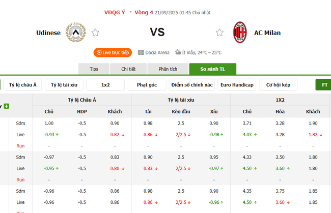 Phán đoán tỷ số - Udinese vs AC Milan