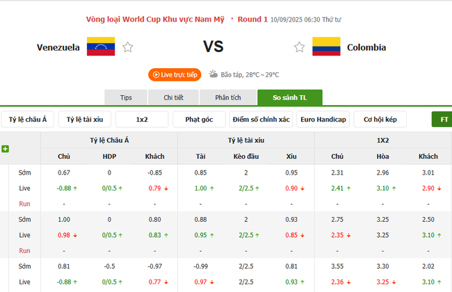 Phán đoán tỷ số - Venezuela vs Colombia